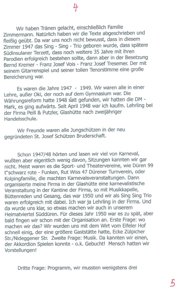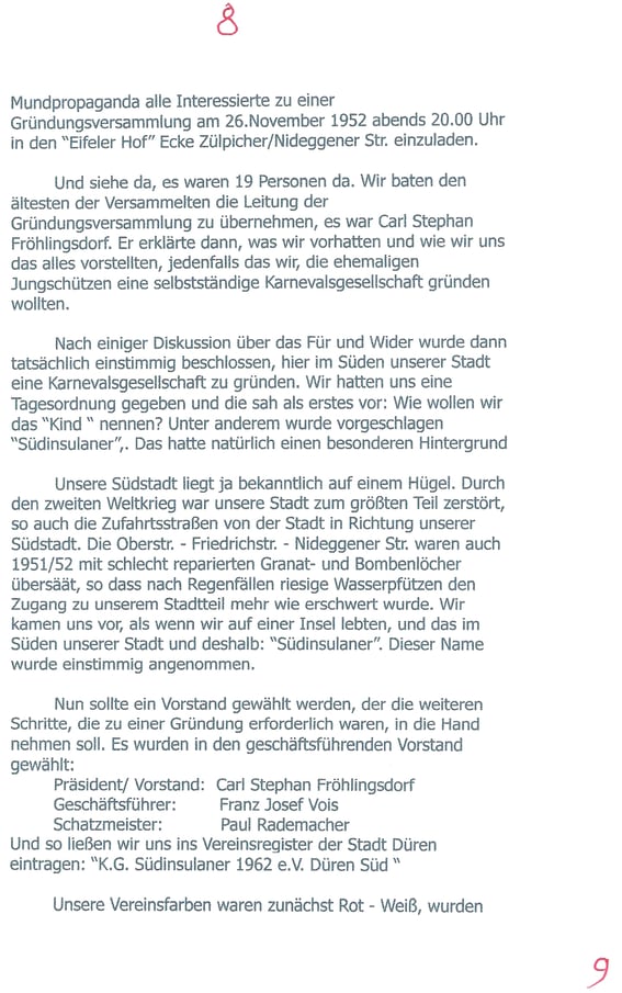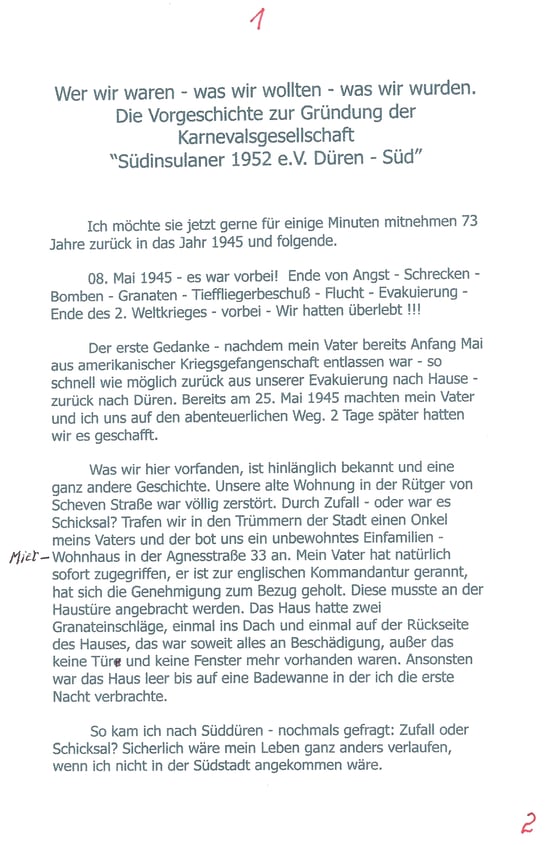 Stephan Johnen, Redakteur der Dürener Zeitung hat sie befragt und Antworten erhalten. Die heute noch lebenden Zeitzeugen der Gründung unserer Südinsulaner, haben ein Zeitzeugnis abgegeben über eine Zeit, die leider viele nicht mehr kennen. Aber es ist wichtig zu wissen, woher wir kommen. Golo Mann hat einmal gesagt: Wer die Vergangenheit nicht kennt, kann die Zukunft nicht verstehen“ . Deshalb sind wir glücklich, daß wir sie noch befragen können, unsere Altvorderen, ob sie nun Gründer waren oder einfach nur aktiv dabei. Mit diesem Artikel wollen wir den Auftakt machen, unsere Geschichte hier einmal aufzuarbeiten